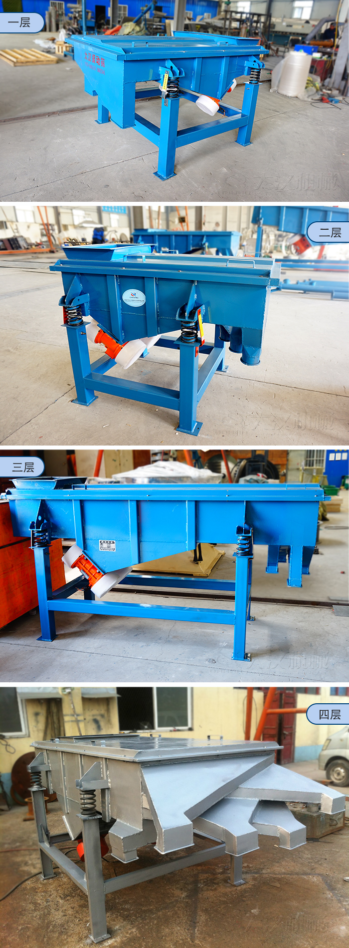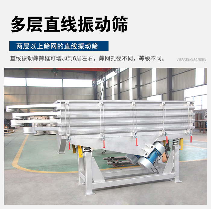 多層直線振動篩是指:兩層以上篩網(wǎng)的直線振動篩,直線振動篩篩框可增加到6層左右,每層的篩網(wǎng)孔徑不同,所篩出的東西就會有不同等級,因此多層的直線振動多使用到一些有特殊要求的行業(yè)中。
